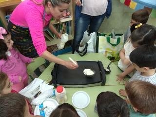 Hechos por nosotros mismos y cocinados en la clase con la ayuda de algunas madres. algunos los rellenamos de crema de cacao, otros de queso y jamón york y otros los dejamos sin relleno.